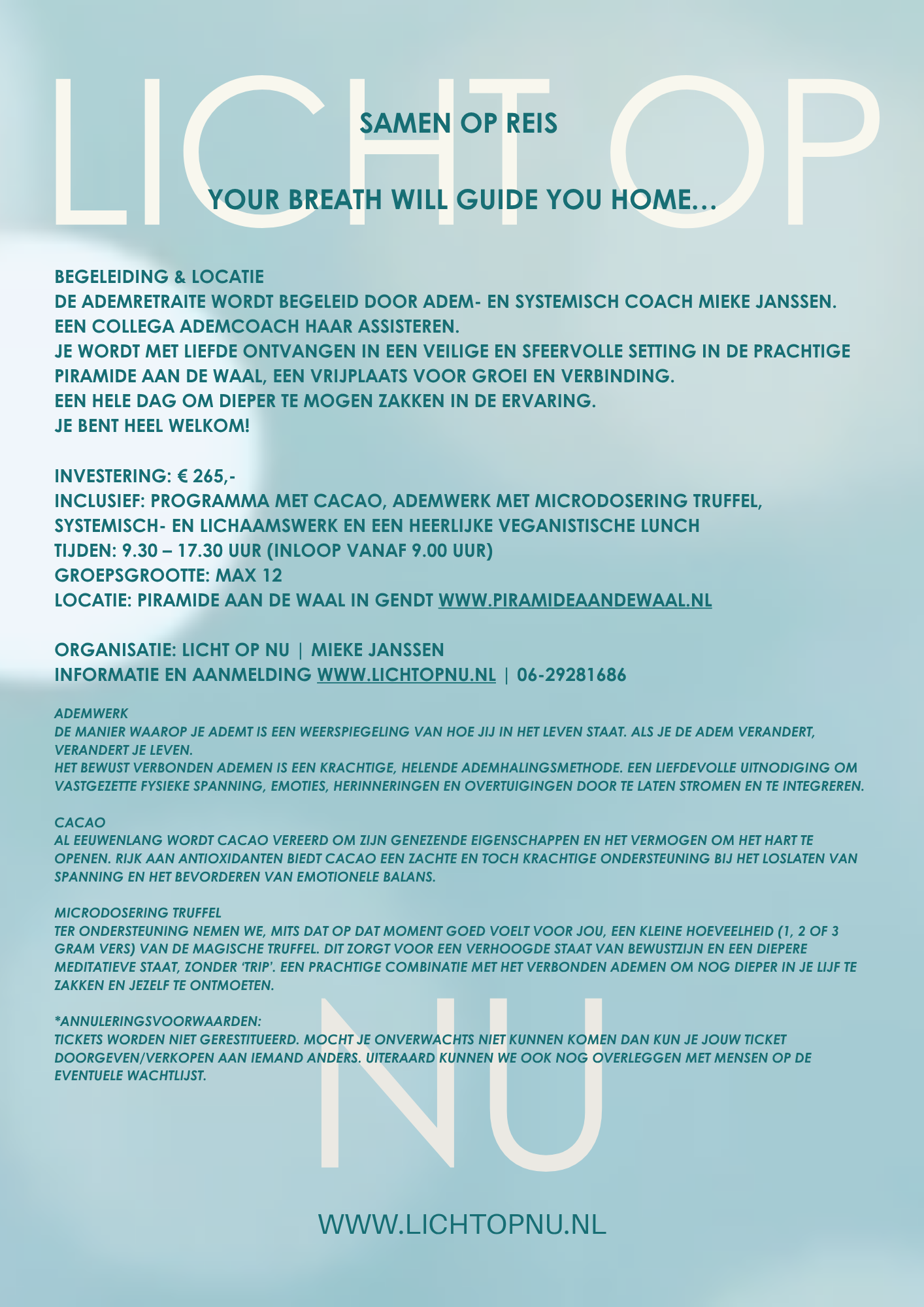 Ook als deze vorm van ademen nieuw voor je is, ben je van harte welkom! Tijdens de introductie zal ik uitleg geven over 'bewust verbonden ademen' en is er alle tijd voor het beantwoorden van eventuele vragen.